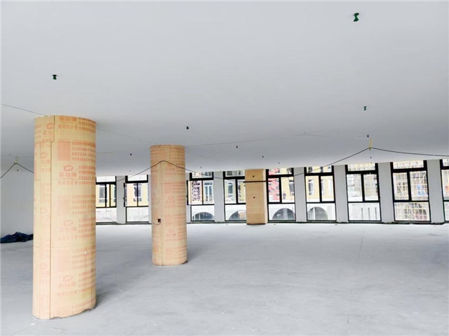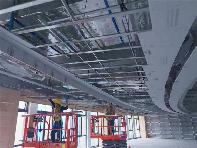 报告厅核心区域的弧形灯槽吊顶,从南至北呈现上升态势,高度相差二十厘米,造型呈圆弧状,弧形半径较大,交叉作业较多。